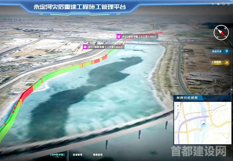 该平台将永定河卢三段、卢梁段综合提升工程7个标段的地下防冲墙bim模型加载至3d gis(三维地理信息系统)平台中,辅以标志性建筑的人工建模,并设置各标段起止位置和桩号,精准体现地下防冲墙地理位置,让管理者直观地掌握施工作业面周围的环境。