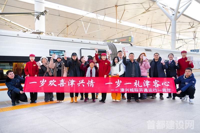 津兴城际铁路开通运营满一周年,乘务员与乘客合影                 ■国铁北京局/供图