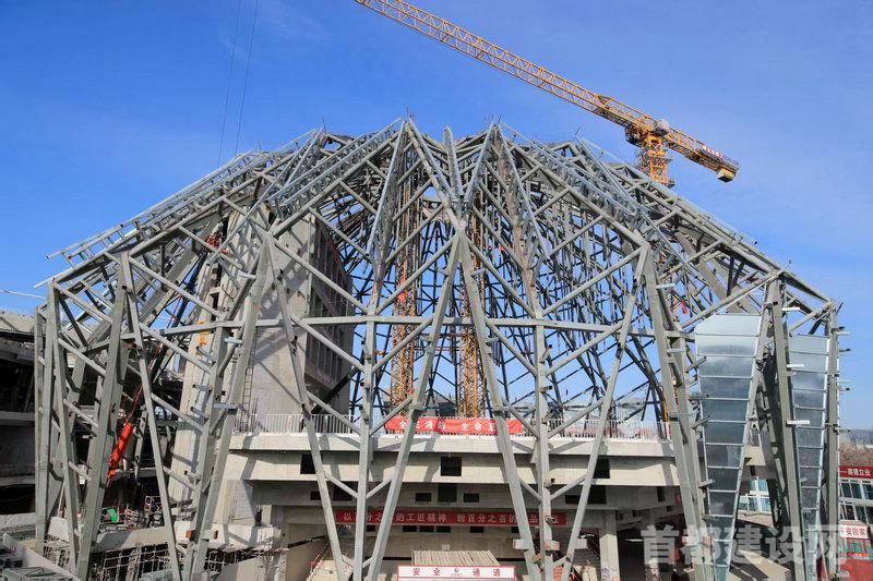 在顶升装置旁边,是43米高的巨大“八宝盒”造型的中国杂技艺术中心主体结构。走进其中,一个从中心向四周呈现放射状的钢结构网架平铺在地面,几名工人正手持焊枪进行作业,黄白色的焊花四处飞溅。很快,这个重达180吨的“帽子”在6根液压顶升装置的合力作用下,于一天内爬升到指定位置。