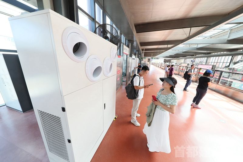 7月17日9时40分,温度已达32摄氏度。像往常一样,北京地铁机电分公司第一项目部的员工来到亦庄线经海路站台,查看站台上蒸发式冷风机的运行情况。目前,冷风机已在北京地铁7条线路16座车站进行了布设。机电分公司第一项目部副经理刘旭告诉记者,亦庄线经海路站是地上车站,每到暑期,车站温度与天气温度“同调”;又因为地上车站受通风影响,空调和风扇很难发挥作用。为此,北京地铁公司与专业公司共同研发了适用于轨道交通的蒸发式冷风机产品。该设备采用蒸发冷却技术进行降温,通过加装射流喷口,送风距离可达8到12米,结合风扩散效果确保乘客活动区域舒适度,能够降低乘客的体感温度。记者亲身体验时发现,四个出风口可灵活调转方向,扩大出风范围。一位候车的乘客表示:“这个风机的风很大,从体感上来说确实凉快不少。”