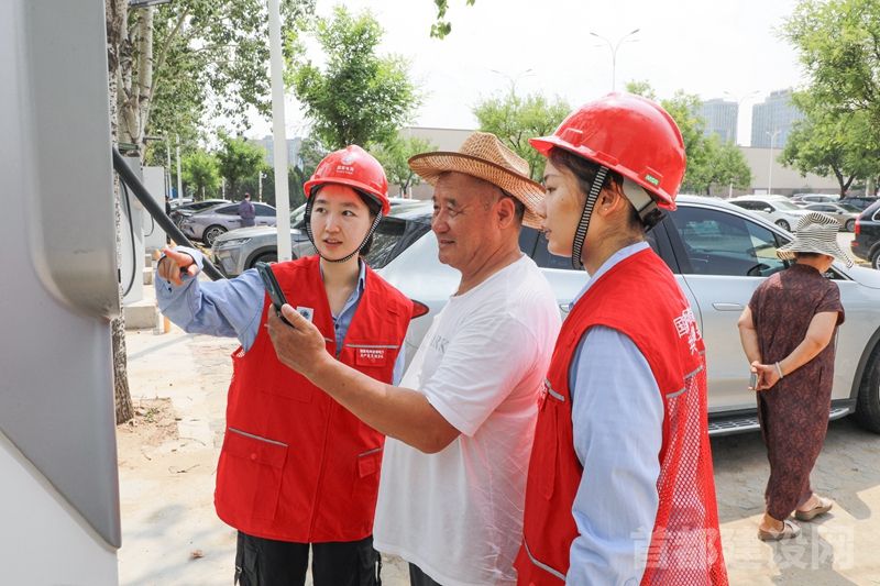 国家电网首都电力(石景山)共产党员服务队队员在沃尔玛超充站向新能源车主讲解充电使用方法 ■通讯员 江江/摄