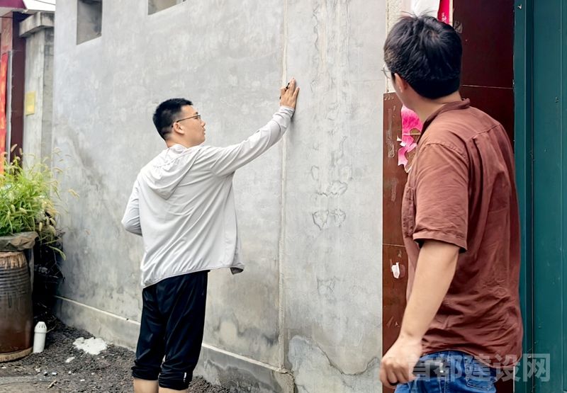 在石城镇红星村,首华建设评估人员在检查一栋老旧房屋时,发现墙体有一条隐蔽的裂缝,从外观看并不显眼,但凭借专业经验,工作人员判断这条裂缝可能对房屋结构造成严重影响。为更准确地评估情况,评估人员在确保安全的前提下,爬上满是泥泞的梯子,近距离观察裂缝的走向和深度。