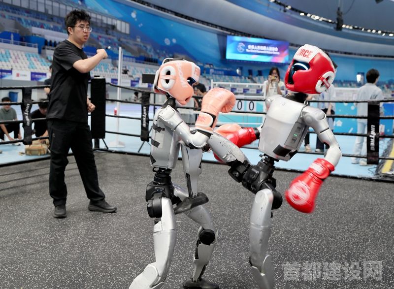 搏击台上,机器人之间打得火热,一旁的教练做出“勾拳”的动作,在对台下的操作者进行指导。
